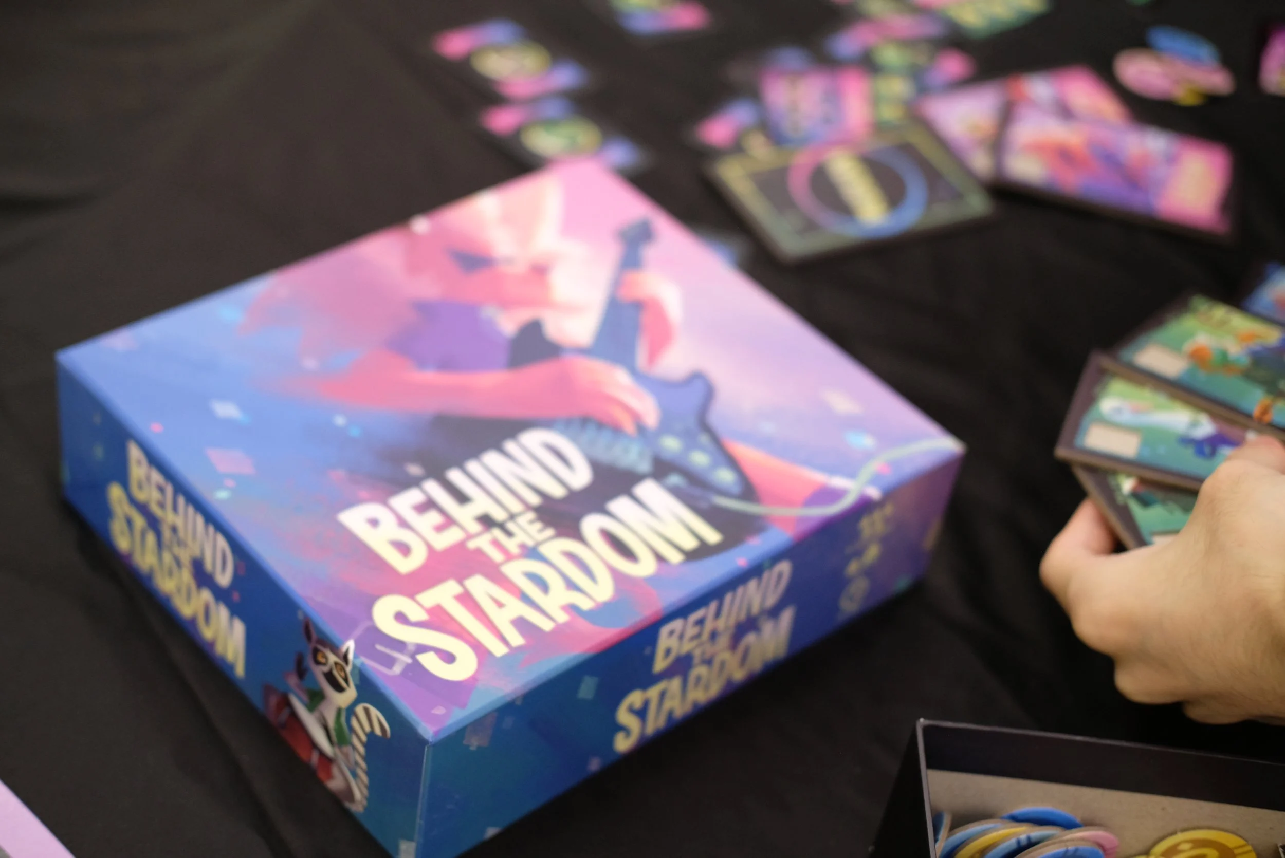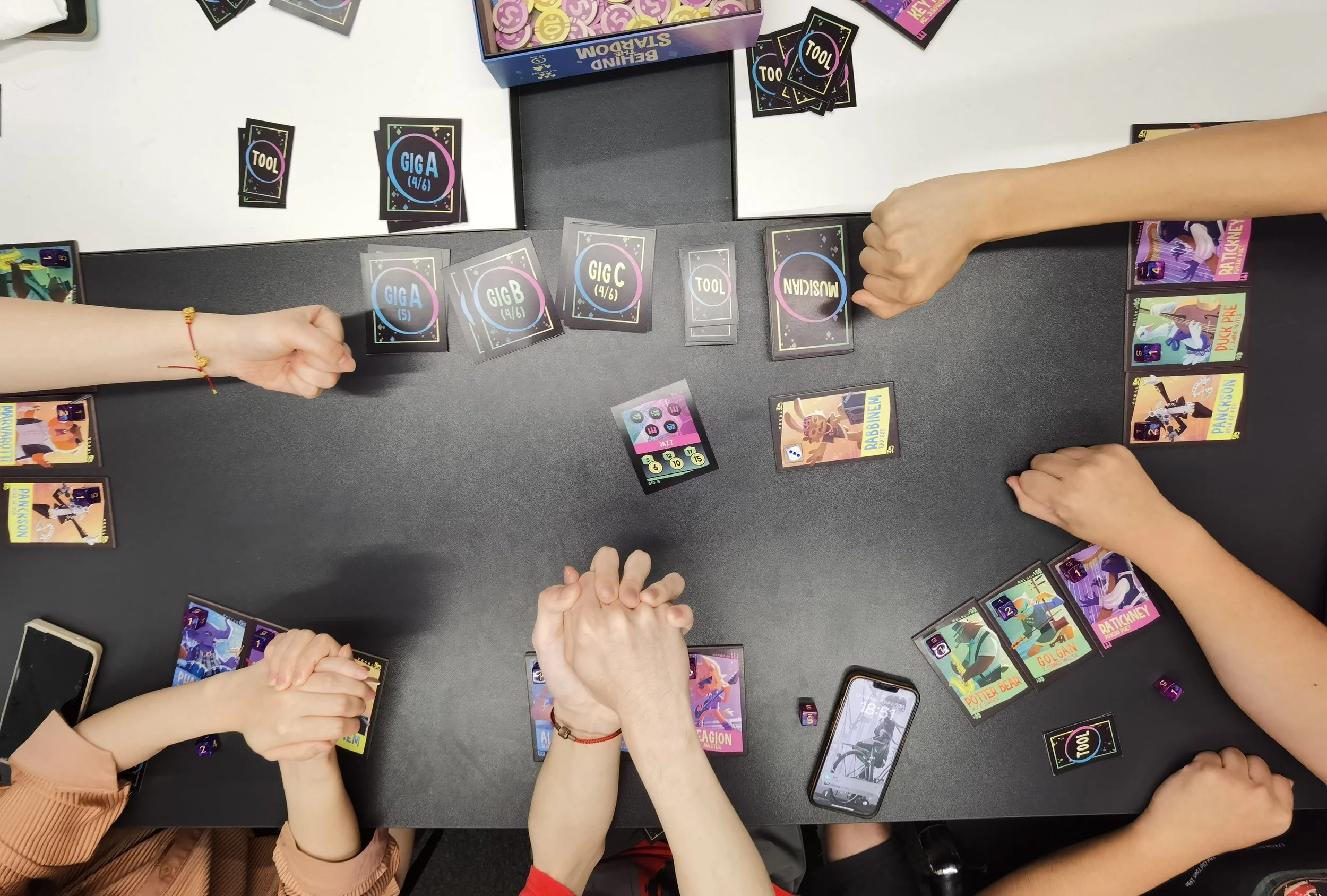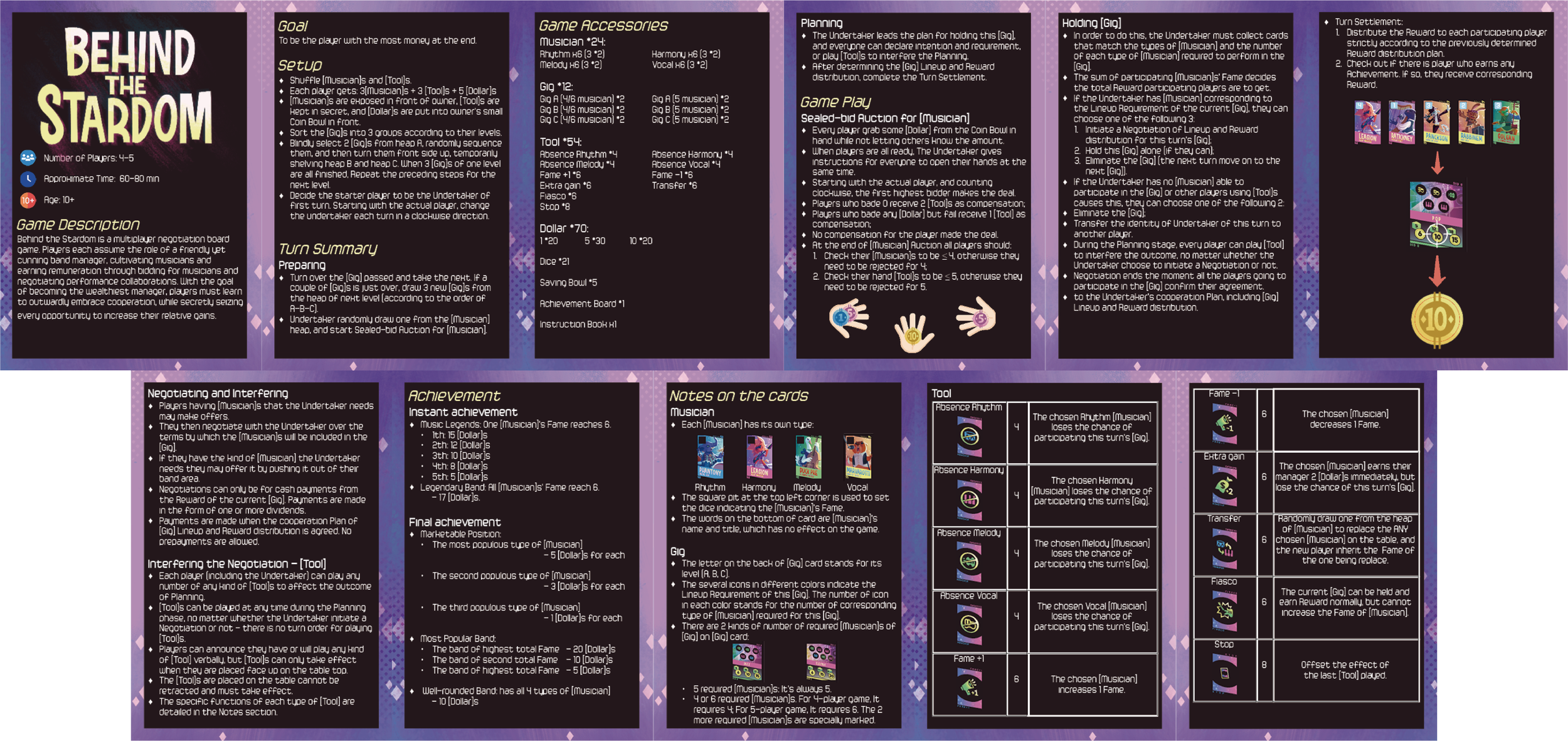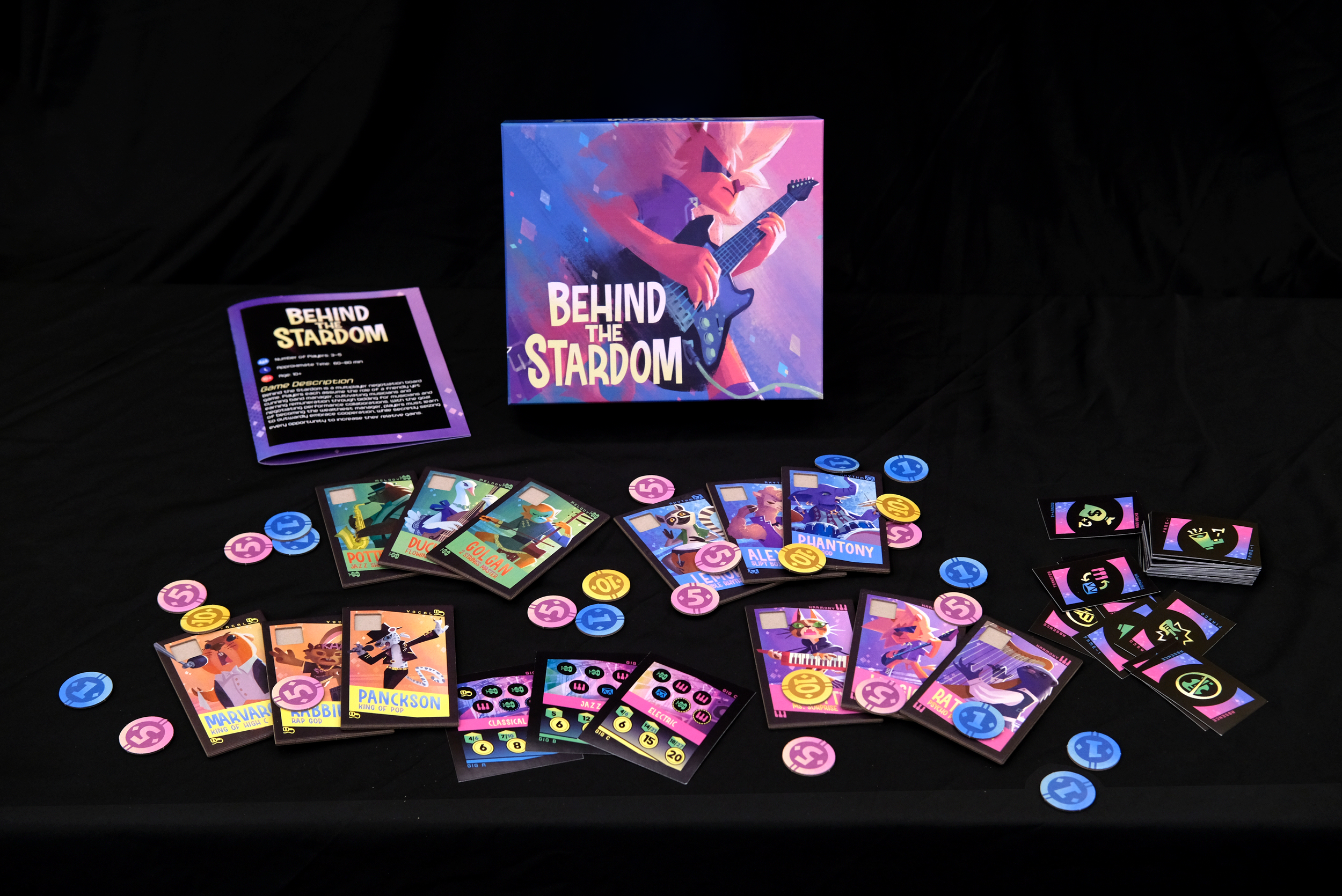 Behind the Stardom is a multiplayer negotiation board game. Players each assume the role of a cunning band manager, cultivating musicians and earning remuneration through bidding for musicians and negotiating performance collaborations. To become the wealthiest manager, players must learn to outwardly embrace cooperation, while secretly seize every opportunity to increase their relative gains.